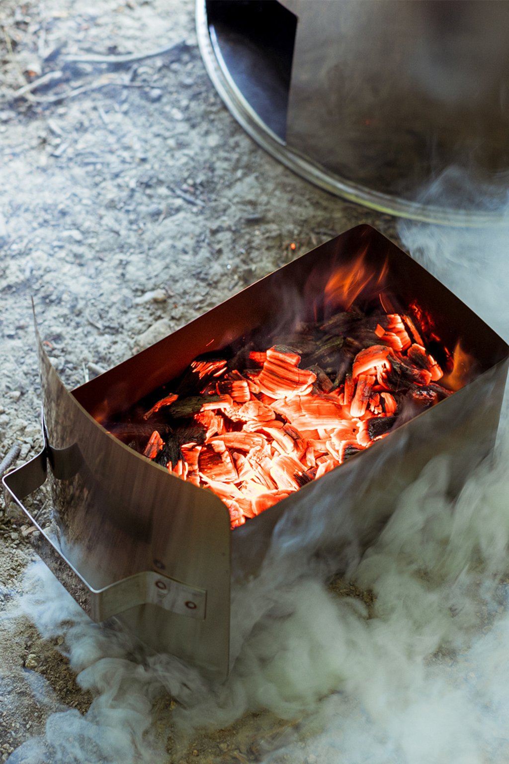 V ohništi roztopíte oheň pomocí hrubé štěpky z tvrdého dřeva nebo klidně drobných klacíků a vytvoříte žhavý základ. Ten pak posypete udícíma pilinama či mokrou štěpkou a kouř je na světě. Fertig.