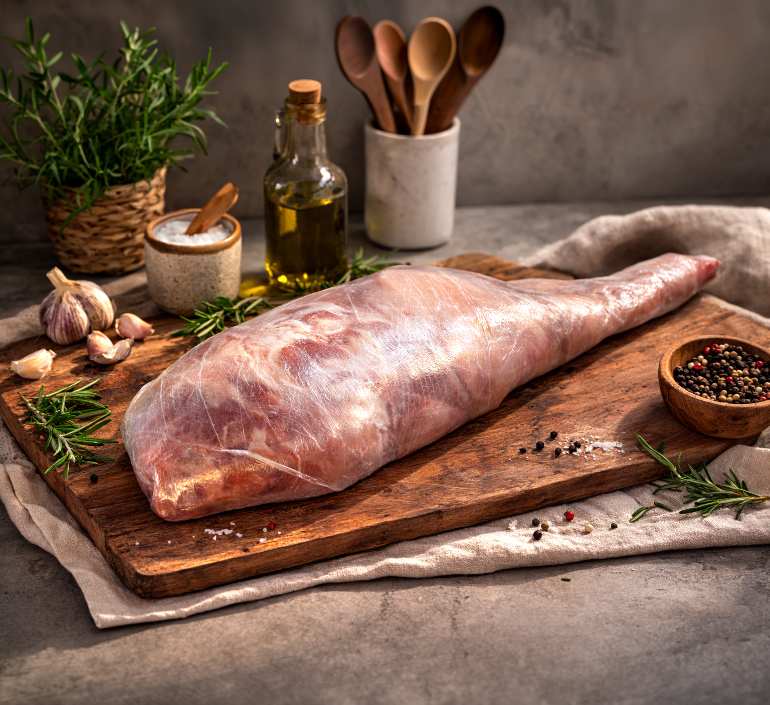 Vychlazenej lák pak rovnoměrně nastříkejte do masa. Na jeden vpich ho pošlete do tří směrů a nejvíc si dejte záležet u kosti a kloubu, protože tam se to rádo kazí, když se to odbyde. Potom kýtu celou potřete rozmačkaným česnekem, já dávám kolem 8 stroužků, a nakonec ji zlehka poprašte pragandou, hlavně v záhybech a kolem kostí. Pak všechno pevně zabalte do fólie a dejte do lednice alespoň na 7 dní. Nic nepokazíte, když ji v průběhu jednou dvakrát obrátíte.