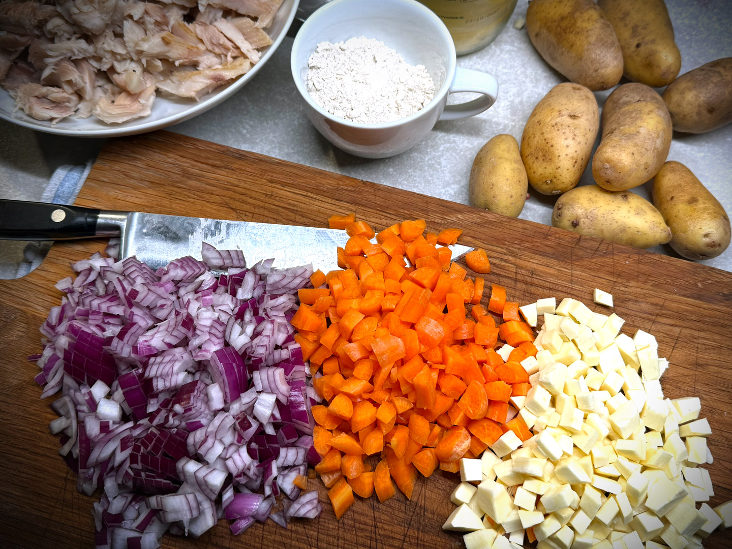 Než začne voda bublat, nakrájejte všechnu zeleninu. Cibuli na drobno, mrkev s pastiňákem na drobný kostky, brambory na dvojnásobný kostky.
