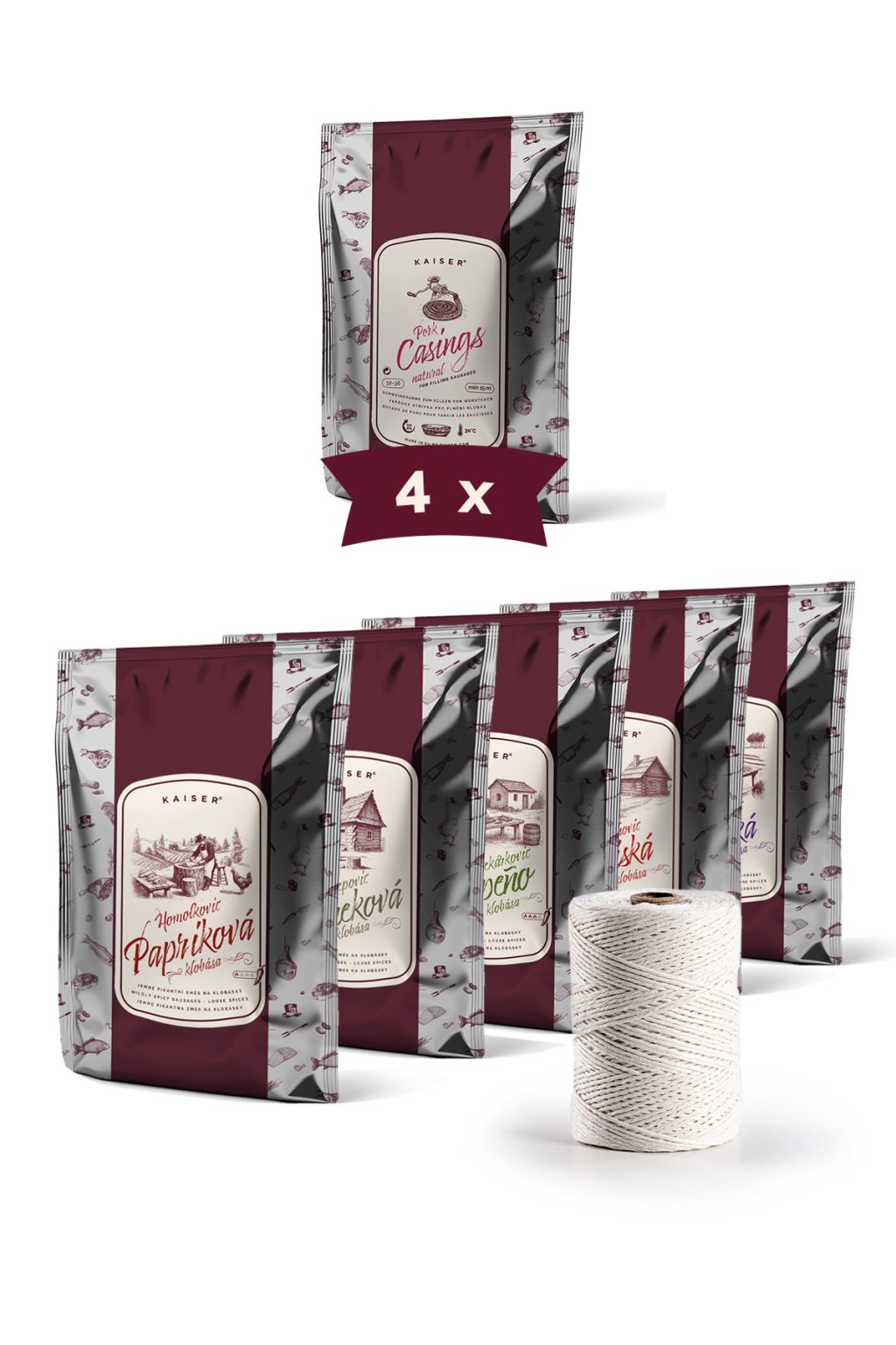 Aby jste nemuseli laborovat jak alchymisti na dvorku, dali jsme dohromady poctivej, šmakózní set koření a udírenský výbavy. Pět receptur, každá jiná povaha: česneková Skořepovic, pikantní papriková Homolkovic, tradiční slovenská Farkašovic Spišská, ostřílená čabajská Horváthovic a pěkně vostrý Pekárkovic Jalapeňo. K tomu pět balíků našich vepřových střev a řeznický provázek, aby nic neupadlo ani po třetím štamprli.