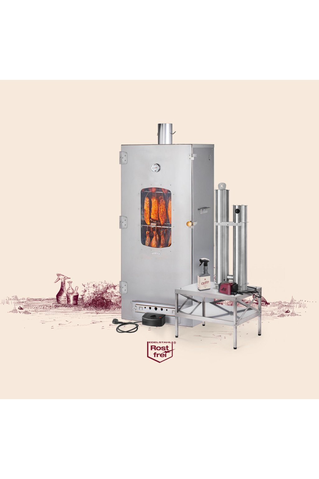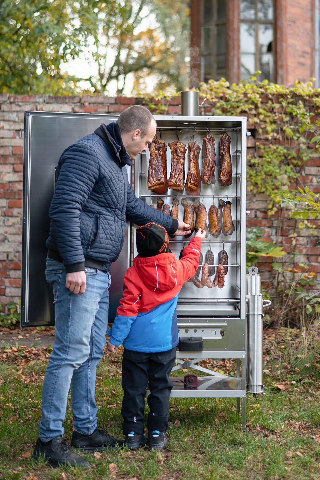 Díky Dvouplášťové izolované konstrukci můžete udírnu používat po celý rok. Je-li teplo nebo zima. Je ideální na zahradu nebo na terasu a jednoduše jí napojíte i na externí kouřovod.