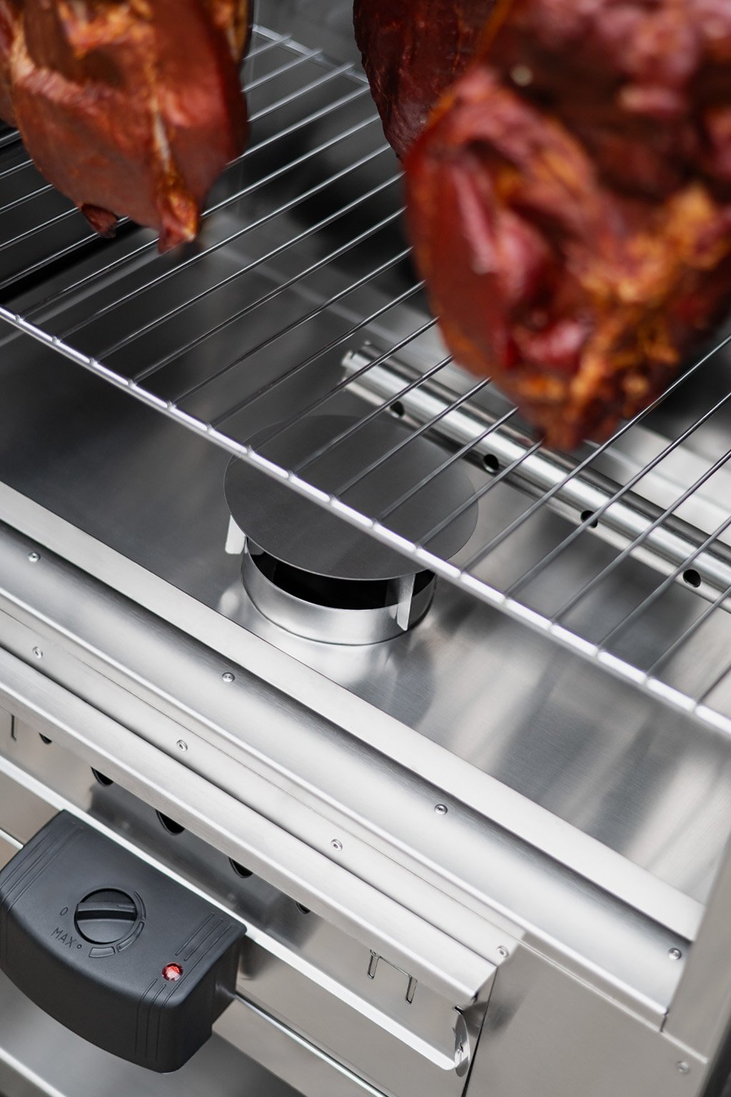 Generátor Smokemeister® naplníte dřevěnou štěpkou, nastavíte intenzitu kouře pomocí vzduchového motorku a o konstantní teplotu v udírně se postará elektrická spirála s termostatem.